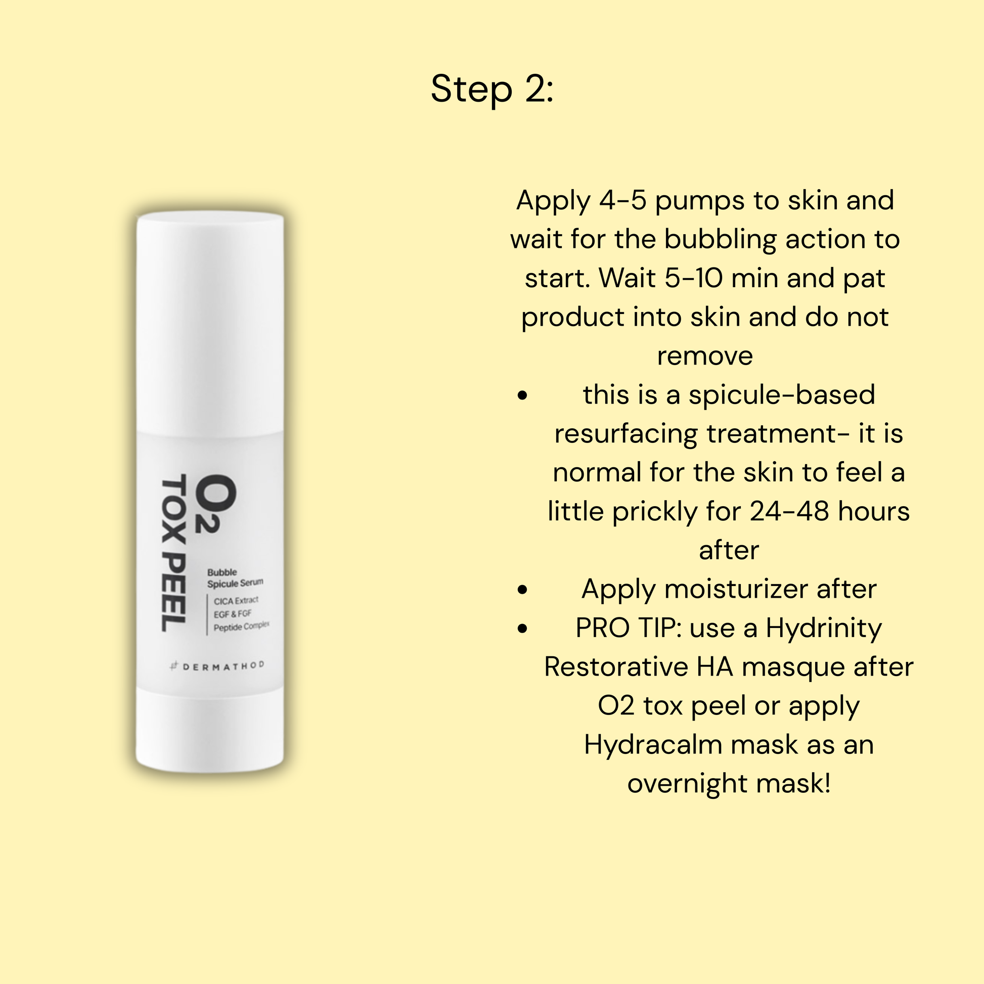 - PRO TIP: use a Hydrinity Restorative HA masque after O2 tox peel or apply Hydracalm mask as an overnight mask!